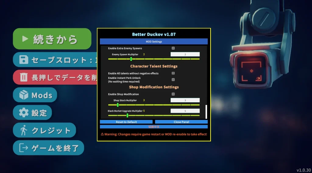このMODは、導入することで難易度を大きく変更する可能性があります。アイテムの重さ軽減や、倉庫の容量変更など初期設定でONになってるものも多く、初期状態で使うとかなりゲーム難易度が下がります。