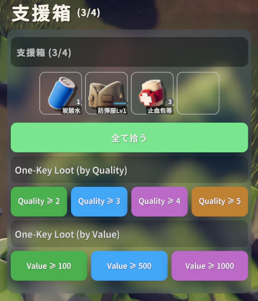 One-Key Loot (by Quality)は、特定の品質以上のものをまとめて回収できるボタンです。緑を押すと緑品質以上を拾えます。
