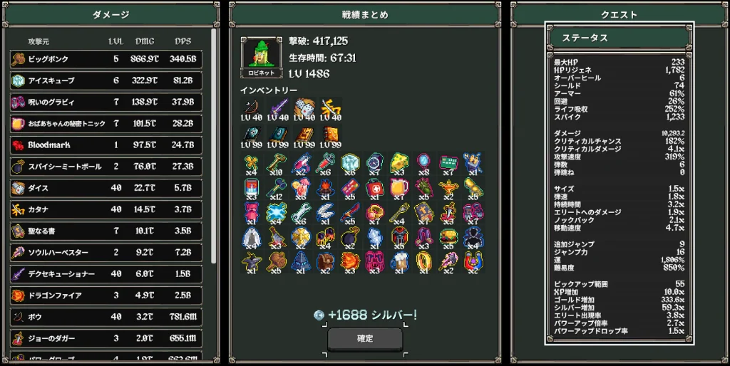 この2つのアイテムを組み合わせることで常にダメージを受け、ゴールドを入手できます。ダメージは序盤とかだと普通に痛いので、ある程度「吸収」のステータスが伸びていないと自傷でやられてしまいます。