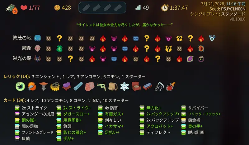 v0.100.0のアップデートが来ています。今回のアップデートは、全てのキャラクターに加わっていて、ゲームの難易度にも影響が及んでいます。また、強かったカード、特にコモンカードで強かったカードが軒並みナーフされています。