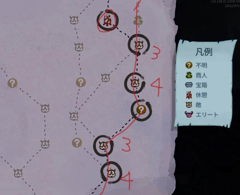 上記のような例でいうと、数字の「4」のところでポーションがドロップしています。本来は、商人部屋を経由してポーションを購入する予定でしたが、直前でポーションが2種揃ったのでルートを変更しています。※本来通る予定のルートは赤で書いています。